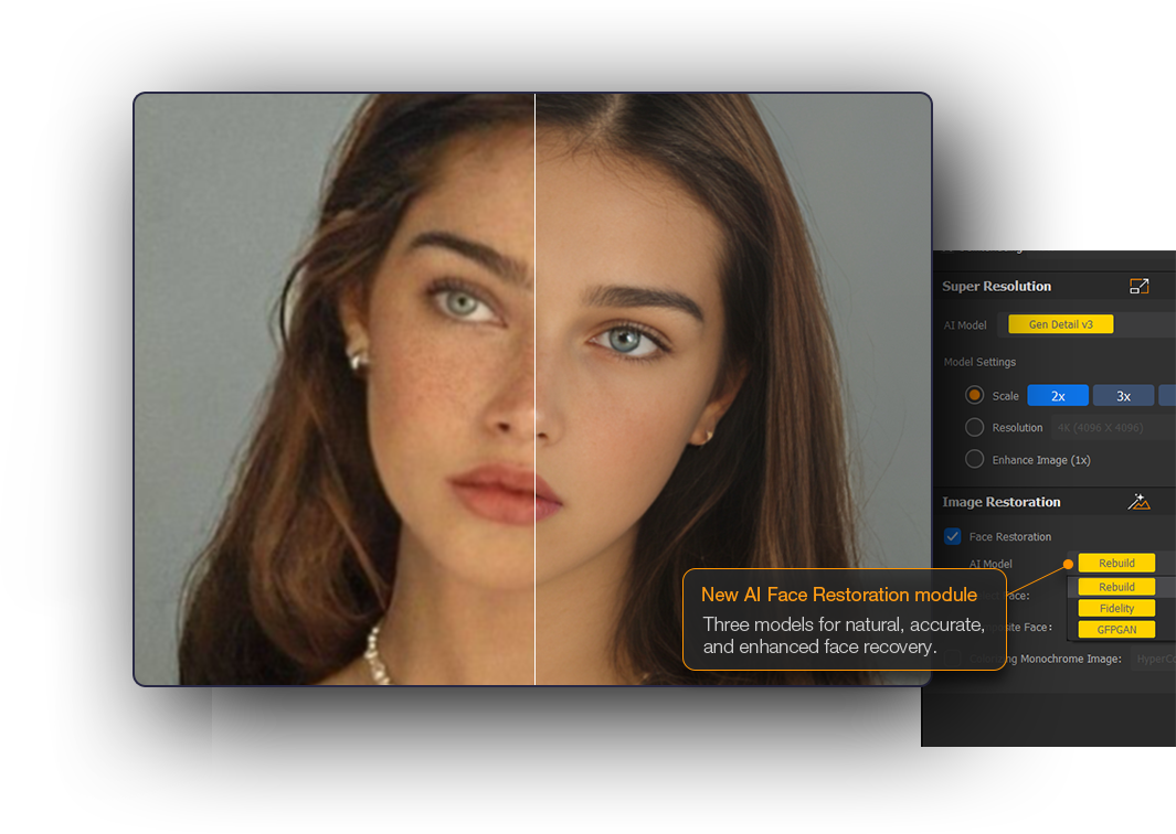 At the core of V4.9 is the new flexibility in the Image AI module, where users can now select 3 tailored AI models to handle every facial restoration scenario with precision: